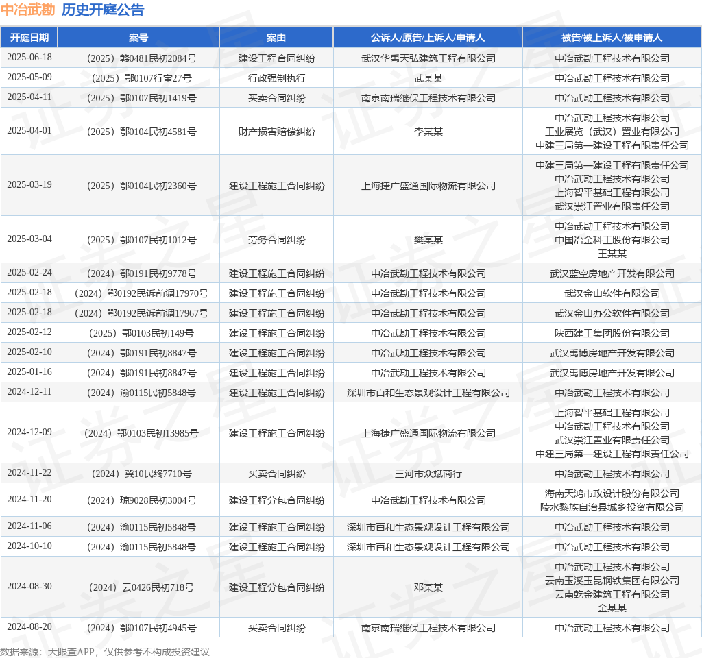 案号:(2025)赣0481民初2084号审理法院:瑞昌市人民法院案由:建设工程合同纠纷当事人信息: 原告/上诉人:武汉华禹天弘建筑工程有限公司 被告/被上诉人:中冶武勘工程技术有限公司开庭日期:2025年6月18日根据统计,近一年内以中冶武勘工程技术有限公司为当事人的历史开庭公告有27则,其中案由为“建设工程施工合同纠纷”的公告以14则居首,其次为“买卖合同纠纷”有4则,“劳务合同纠纷”有2则。历史开庭公告(前20条)如下: